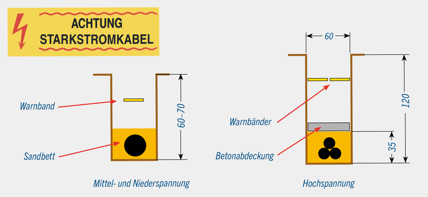Um so wichtiger ist es, die bereits bestehenden Versorgungsleitungen zu schützen, wenn in ihrer Nähe Erdarbeiten stattfinden sollen. Doch schon beim Einbringen der Leitungen muss sorgfältig und umsichtig gearbeitet werden. Moderne Kunststoffisolierte Stromkabel im Mittel- und Niederspannungsbereich werden heute mit einer Überdeckung von 50 bis 60 cm in einem Sandbett verlegt. Der Sand schützt die PE- bzw. PVC-Ummantelung vor Beschädigungen. In einem Abstand von 20 bis 30 cm über der Leitung werden nach Möglichkeit Warnbänder eingebracht. In bestimmten Fällen – z.B. an Straßenkreuzungen und Hofeinfahrten – verlaufen die Kabel meist in Schutzrohren.